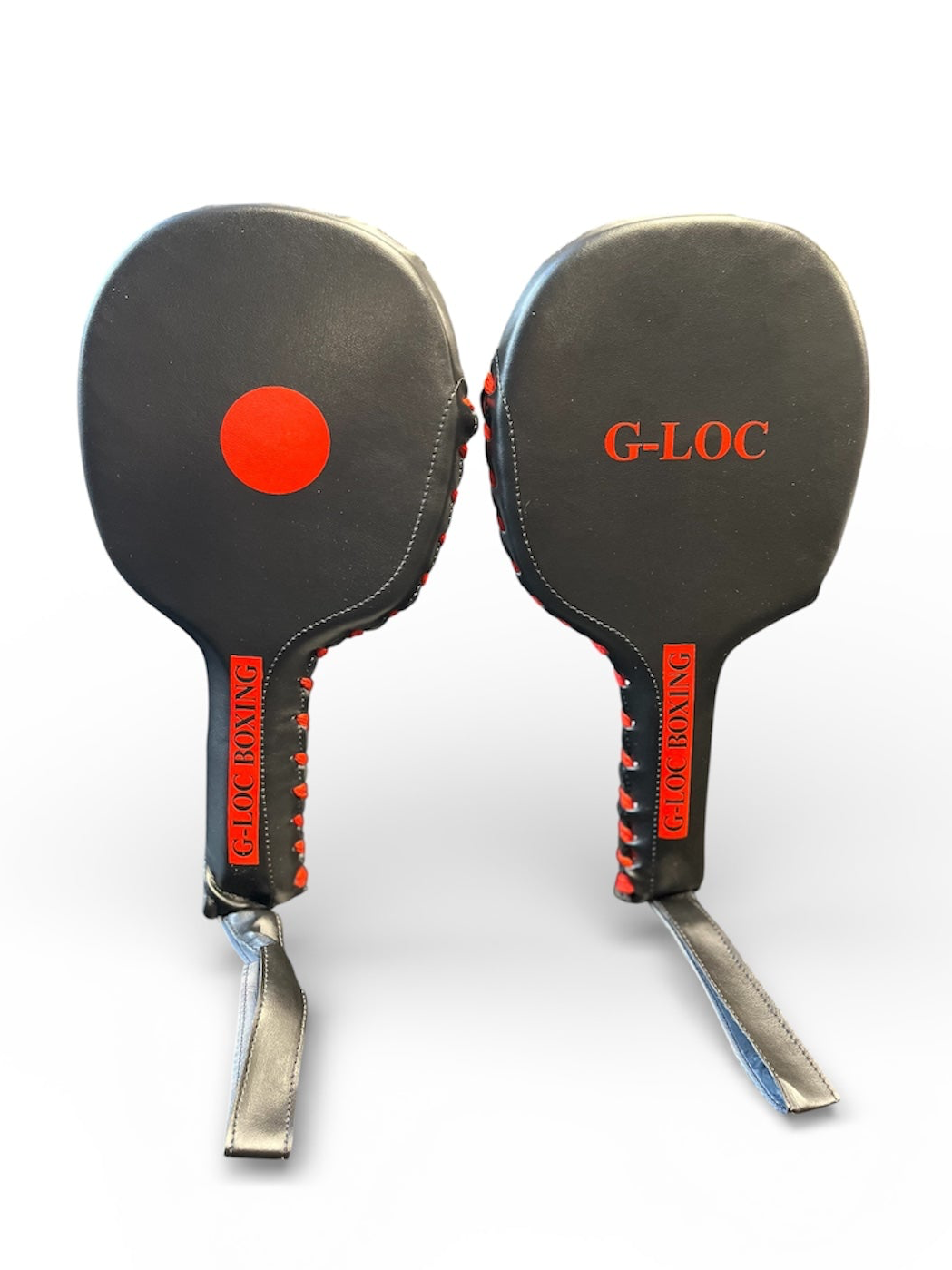Black PU leather paddle mitts with a detailed red stitch. Perfect for speed and precision training. Durable and long lasting.